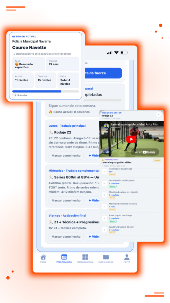 - Planificación adaptada a tus pruebas, tiempos y objetivo de baremo.