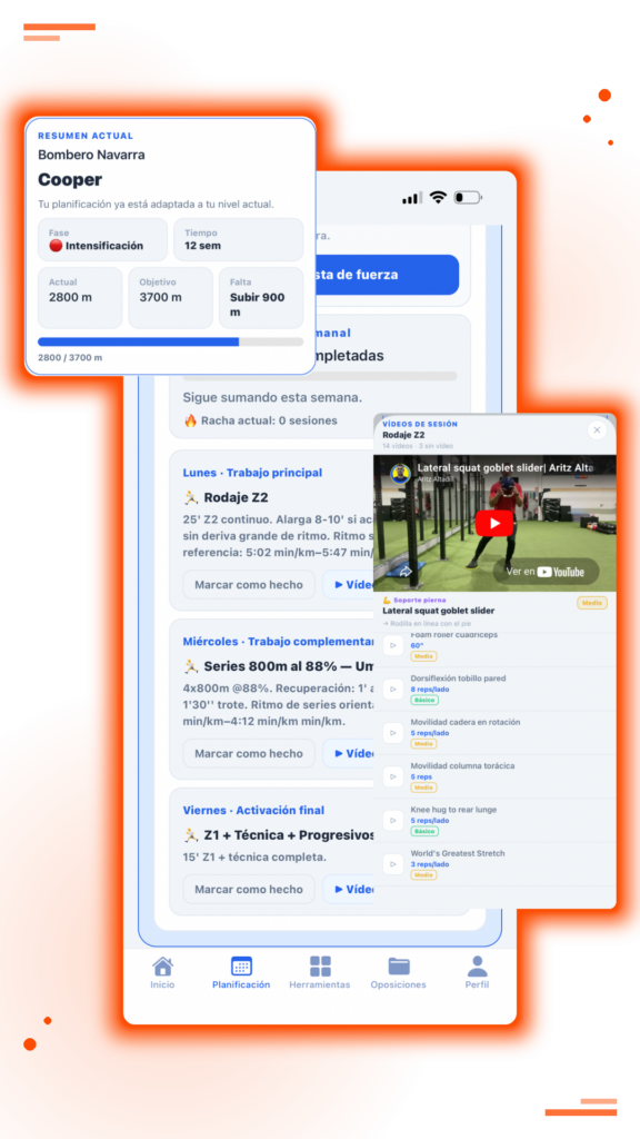 Completamente. Los planes genéricos no saben qué prueba tienes, cuánto te falta para el objetivo ni en qué momento de la convocatoria estás. La app ajusta cada sesión a tu oposición, tu marca actual y tu fecha de examen — algo que un vídeo nunca puede hacer.